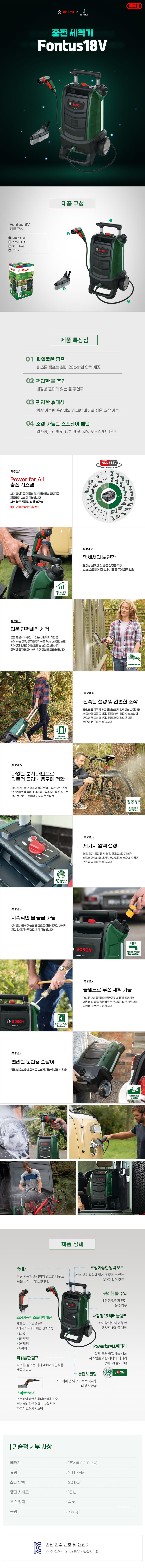 보쉬 Fontus 18V 충전 세척기 본체 20bar 브러시 세척건포함 호스 4m