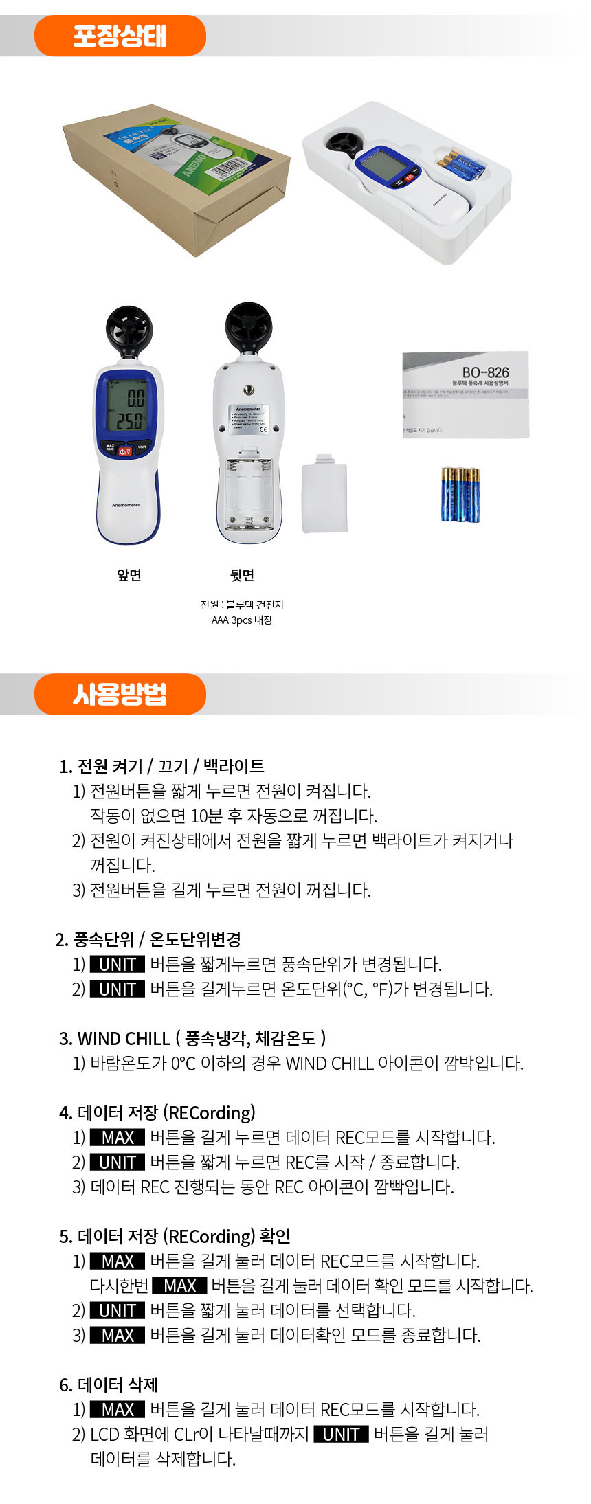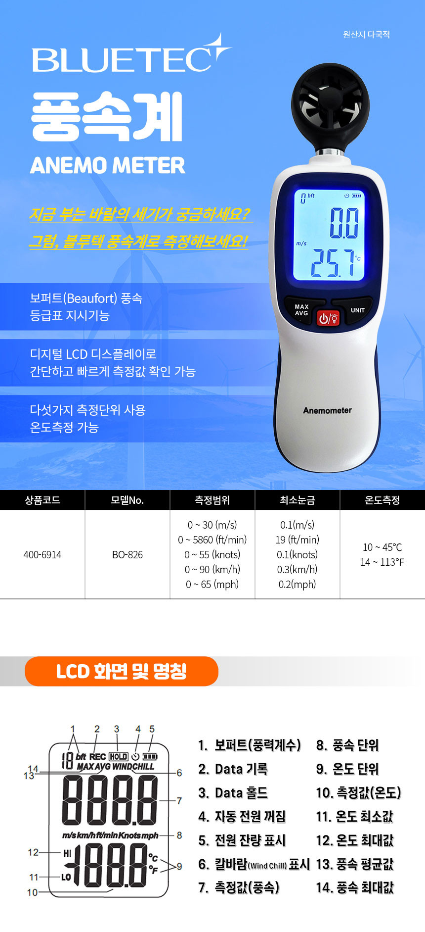 블루텍 디지털 휴대용 가정용 풍속계 풍향계 풍량계 풍향풍속계 바람 측정기 BO-826