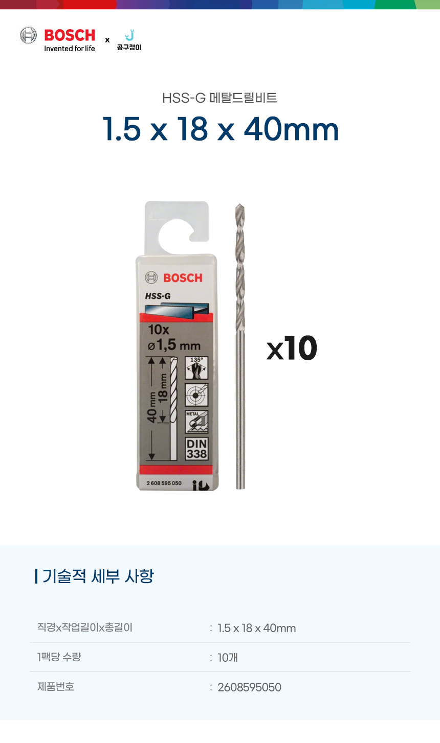 보쉬 HSS-G 메탈드릴비트 1.5 x 18 x 40mm 10PCS 2608595050