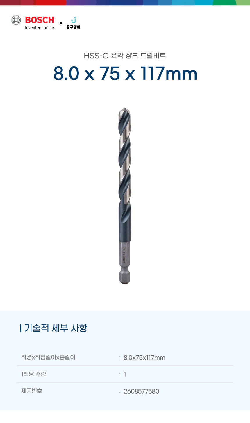 보쉬 육각샹크 메탈 드릴비트 임팩트 HSS-G 금속용 8.0x75x117mm 2608577580