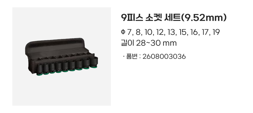 구매하기 + 추가 옵션 선택 추가구성 옵션 선택 PRO 9피스 소켓 세트(2608003036)(+30,500) PRO 9피스 롱소켓 세트(2608003037)(+47,500) 총 금액 0 원 장바구니 구매하기