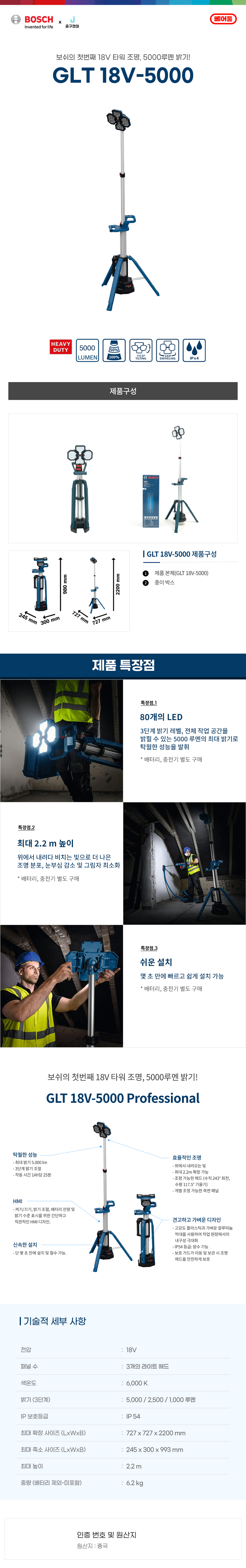 보쉬 GLT 18V-5000 타워형 충전 랜턴 베어툴 LED 작업등 5000루멘